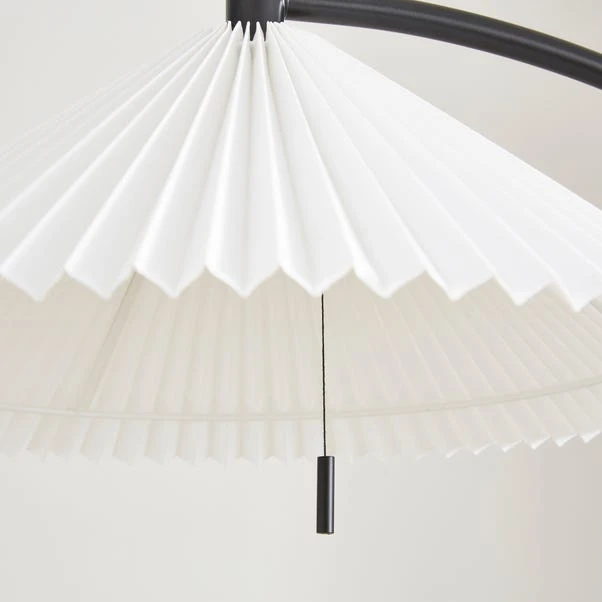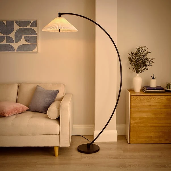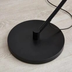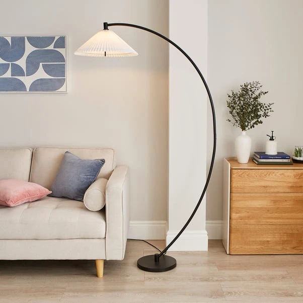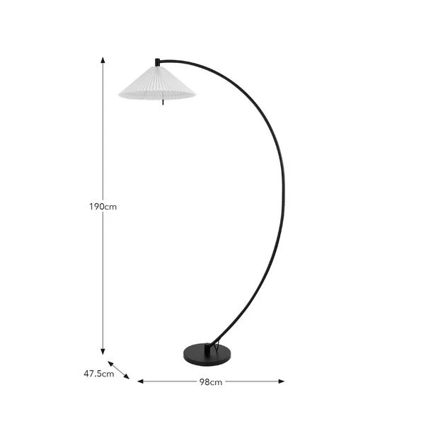 This floor lamp boasts a very unique design with an arched silhouette, a sleek matt black metal frame, and a white lamp shade. Itβs an eye-catching addition to any home.