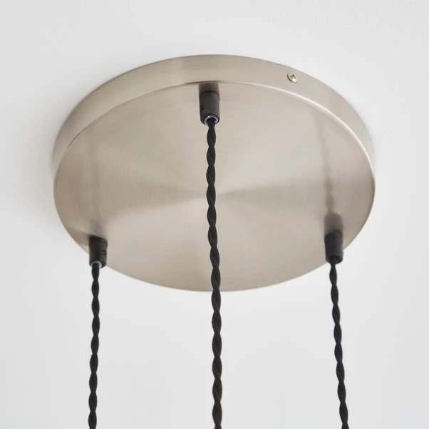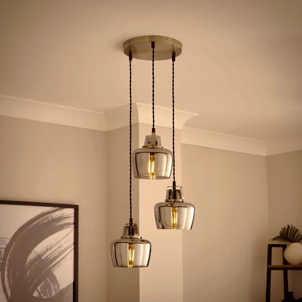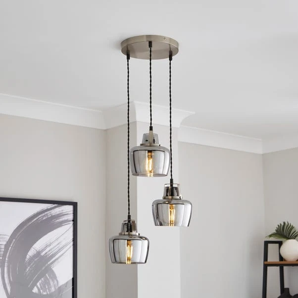 Add a statement to your ceiling with the Auburn Industrial 3 Light Adjustable Cluster Ceiling Light. A unique twist, this light features three smoked glass shades and sturdy satin-nickel metalwork – effortlessly complementing both modern and classic interiors.