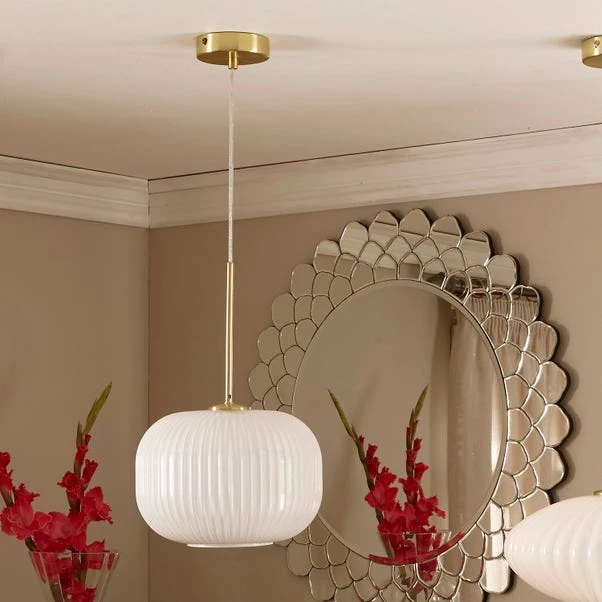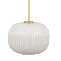 The Bella Ribbed Squoval Pendant features milky white glass with a delicately ribbed texture and gold metal detailing, offering a modern aesthetic. Hang it alone or in a set with a calex bulb for a diffused glow, adding a touch of drama to your room.