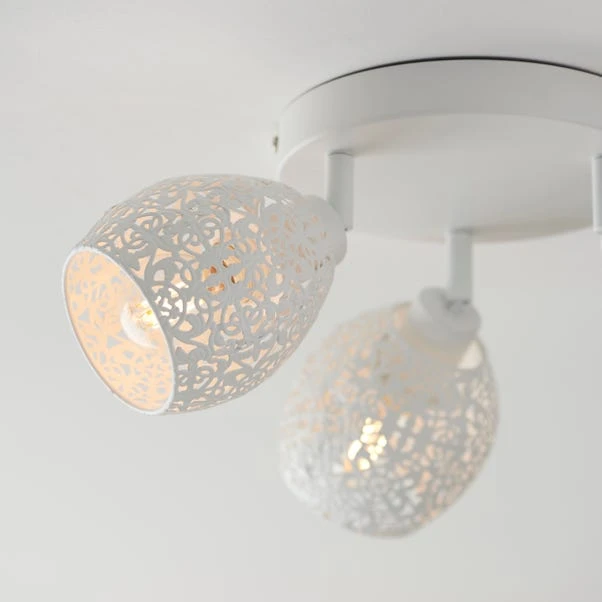 Add a feminine touch to your home with this gorgeous Fearne 3 Light Spotlight, beautifully designed with a matt white paint metal base and 3 spotlights with dainty patterned detail shades. This spotlight will look beautiful in any room and you can even coordinate your home with matching family items. Dimmable compatible with a suitable light switch and bulb.
