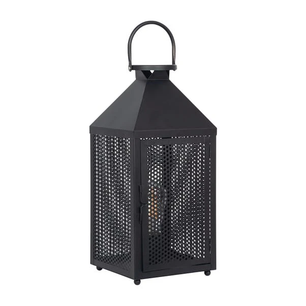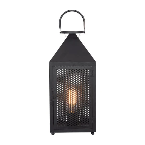 Bring industrial chic into your home with the Folkstone Metal Punched Lantern Table Lamp, featuring a matt black finish and mesh panels for atmospheric lighting. Ideal for any interior space, it adds a touch of homely warmth, also available as a floor lamp.