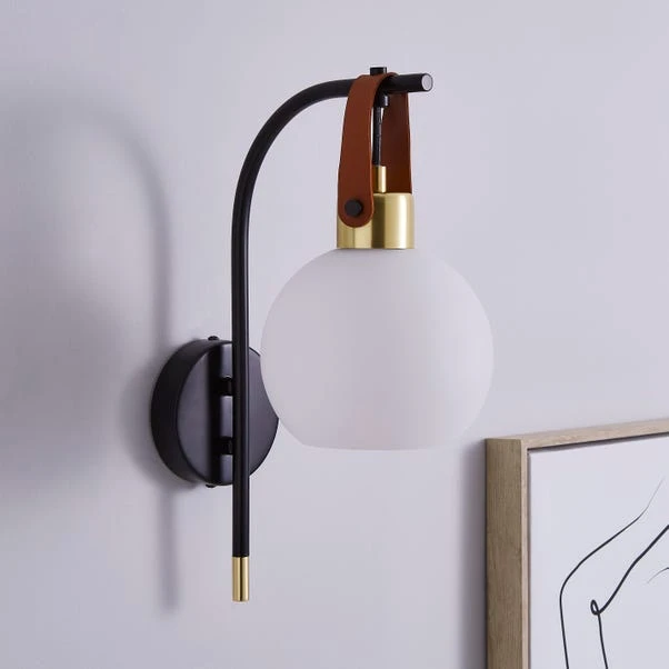 Featuring the modern Joan Wall Light, with a hanging white glass shade and finished in black metal with a Faux leather strap. With its modern colour way, this light will complement an array of home decors. Matching family items available to help coordinate your home.