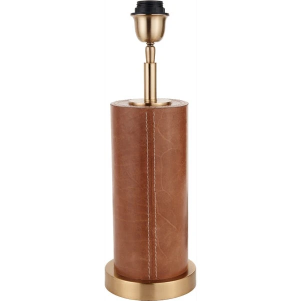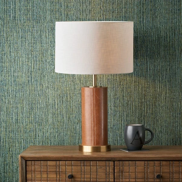The Laurence Tan Faux Leather and Brass Cylindrical Table Lamp with 35cm Linen Drum Shade creates a bold statement with its melange of tan buffalo leather and brass metal detailing. Paired with a modern 35cm white cylinder linen shade, this lamp is stylish and versatile, allowing light to filter through the open weave material.
