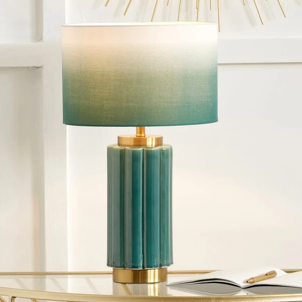 The Lushan Scalloped Ceramic Table Lamp is an elegant cylindrical, scalloped lamp in a statement brushed gold. The striking base showcases a stylish ombre, self-lined shade, adding a touch of colour to any interior and offering a sophisticated focal point.