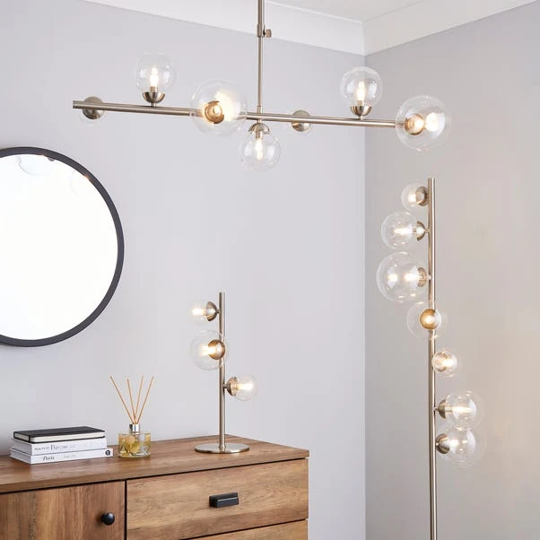 This ceiling fitting is the perfect piece to accompany and add a touch of style to any room of the house, with a modern nickel colourway that will complement an array of home decors. The height of the whole light can be adjusted to suit your taste and is compatible with dimmer lights, with matching family items are also available.