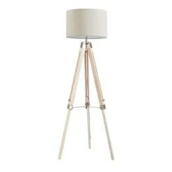 Stylishly crafted, this contemporary floor lamp features a wooden tripod design base with faux linen cylinder shade finished in a natural colourway. A perfect floor lamp to inject a modern and rustic touch to your home decor.