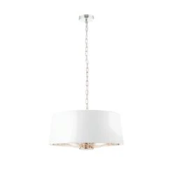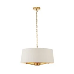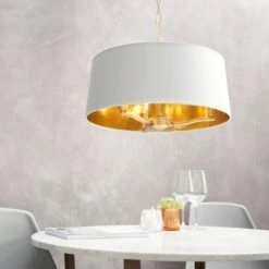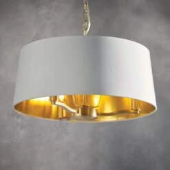 Add a touch of class with this luxury 3 light pendant shade featuring a single vintage faux white silk shade with metallic inner and contrasting brushed satin gold effect plated finish. There’s no doubt your home will be looking on trendy yet traditional!
