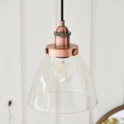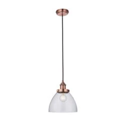 Featuring the Vogue Tobermory 1 Light Ceiling Fitting, an authentic ‘resto’ style industrial pendant, finished in aged copper plating with authentic knurled lamp holder details and clear glass shades. This piece is suspended from a height adjustable black fabric flex, pair with filament LED lamps for that perfect industrial style. The perfect addition for today’s stylish homes to create that on trend bar, bistro look.